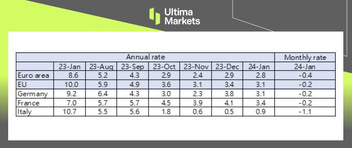 为了解欧洲央行面临的挑战,我们必须留意审视关键经济指标。2024年1月欧元区(EA)年通胀率为2.8%,低于12月的2.9%。一年前,该比率为8.6%。 2024年1月,欧盟(EU)年通胀率为3.1%,较12月的3.4%下降。这一比率一年前高达10.0%。欧元区最大的三个经济体德国、法国和义大利在对抗高物价方面取得实质进展,通胀数字稳定压在4%以下。