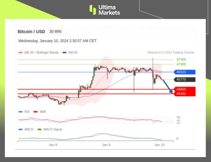 Dalam analisis komprehensif ini, Ultima Markets memberikan Anda rincian mendalam mengenai BTCUSD untuk tanggal 10 Januari 2024.