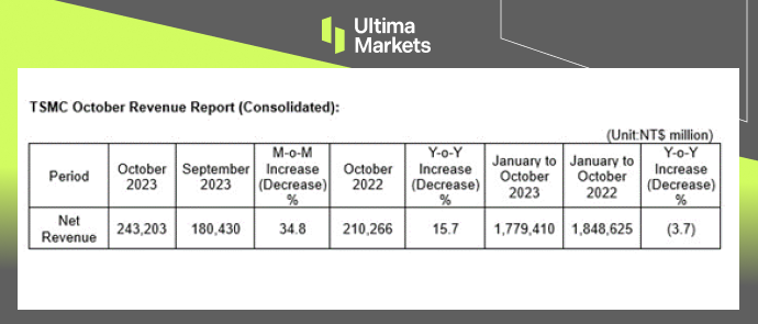 Pada 10 November, Taiwan Semiconductor Manufacturing Company (TSM.US) mengumumkan bahwa pendapatan bulan Oktober mencapai rekor US$7,53 miliar (NT$243,2 miliar), yang mewakili peningkatan 34,8% dari bulan September dan peningkatan 15,7% dari periode yang sama tahun lalu. Meskipun beberapa pelanggan masih melakukan penyesuaian inventaris karena permintaan global yang lebih lemah, terutama di bidang elektronik konsumen, pendapatan kumulatif TSMC selama 10 bulan pertama tahun 2023 mencapai US$55,6 miliar, turun 3,7% dari periode yang sama di tahun 2022. Permintaan yang kuat untuk teknologi 3nm TSMC berkontribusi pada ADR yang melonjak lebih dari 6% setelah rilis pendapatan.