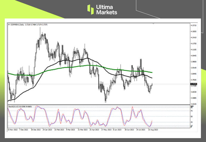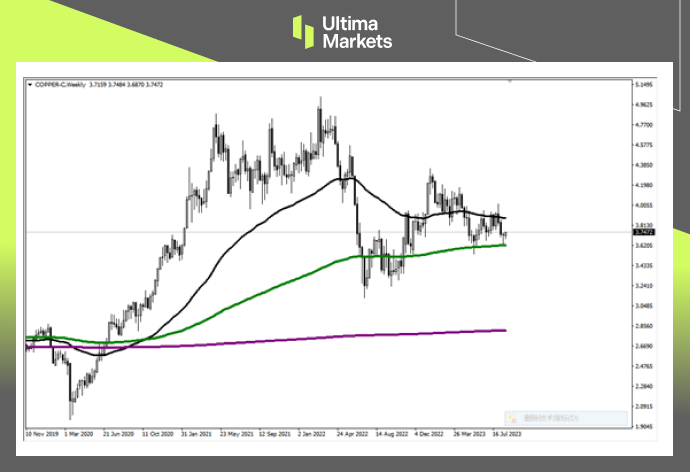 根据伦铜(Ultima Markets MT4上代码为COPPER-C)日线图来看,行情的金叉已经形成,本周的短期多头趋势是大概率事件。65日周期均线是铜价的第一目标位,若价格被突破则行情将受空头止损离场的因素,导致行情快速上行。
