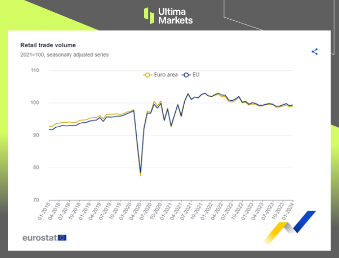 另外,2024 年 1 月,歐元區零售額較上月微幅增長0.1%,12 月修正後數值報收縮 0.6%,與市場預測相符。 食品、飲料和菸草等產品銷售額成長 1.0%,結束三個月的低迷,汽車燃料成長 1.7%,創下 2022 年 8 月以來的最高水準。相反地,繼上月下降0.9% 後,非食品產品下滑 0.2%。 以年率計,消費品零售總額下降1.0%,連續第16個月負值。